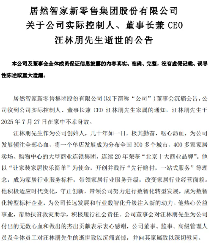 - 湖北前首富,又一次被关注到。 - 7月23日,居然智家(000785.SZ)发布公告:武汉市江汉区监察委员会对汪林朋 “解除留置,变更为责令候查” 。四天后,这位57岁的家居巨头掌舵人从家中高楼纵身跃下,生命戛然而止。  - 十日前,7月17日凌晨,广州靓家居创始人曾育周从18楼跃下。他坠亡24小时后,这家服务过55万家庭的装修巨头全国160家门店同时关闭,官网变成冰冷的404页面。 - 十天之内,两位百亿家居帝国创始人接连坠亡,揭示了依附于地产链条上的家居行业,正经历着怎样的困境。  - 叹息十日:两位行业巨擘的陨落 - 7月27日,汪林朋的死讯在行业微信群中悄然扩散。“这次,轮到居然了。” 一位业内人士的叹息,折射出整个行业的无力。 - 短短十天内的两起悲剧,震惊了中国家居家装行业。曾育周和汪林朋,两位曾经的行业标杆人物,以同样惨烈的方式告别了他们一手创建的商业王国。 - 曾育周的生命终点充满讽刺。他坠亡时口袋里还装着未看完的公司报表。这位被业内尊为 “整装校长” 的企业家,曾以388元/㎡全包套餐颠覆传统家装模式,将靓家居从广州小建材店发展为年营收20亿的行业巨头。 - 汪林朋的结局同样令人唏嘘。今年3月在公司座谈会上,他刚驳斥过“跑路”传言:“我既没有退休打算,更没想过逃避责任。” 他激情洋溢地鼓动团队:“将来要活到120到150岁才行!不能退,退了人生会很无聊。” - 然而短短四个月后,这位曾高喊“不躺平”的企业家,最终选择永远躺下。 - 多重困境:经营数据令人触目惊心 - 汪林朋生命的最后四个月,经历了多重困境。4月17日,居然智家突然公告汪林朋被武汉市江汉区监察委员会留置。这位湖北前首富就此消失在公众视野。 - 7月23日解除留置看似曙光,实则暗藏更大危机。汪林朋名下3.72亿股被100%冻结,公司融资通道彻底关闭。任何可能的起诉书都会触发银行抽贷与债券违约,企业命悬一线。 - 居然智家的经营数据令人触目惊心:2024年净利润同比下滑32%,资产负债率60%,一年内到期负债93亿元,账面现金仅47亿元。卖场出租率跌至78%,转型投入超40亿元却收效甚微。 - 从“湖北首富”到“负面典型”,汪林朋承受着巨大心理落差。留置期间,其母亲、妻子及两名高管相继被带走协助调查。信用崩塌与社交圈断裂,让这位曾经风光无限的企业家陷入孤立无援的境地。 - 曾育周同样面临无法逾越的经营深渊。靓家居160家门店每月刚性支出超5000万,而装修行业毛利率仅15%。为维持运营,他不断拉长供应商账期,从30天拖到180天,形成恶性循环。当赖以生存的源头活水(地产交易)枯竭,再精巧的资金腾挪也难以为继。 - 行业塌方:地产断流,模式崩盘 - 家居行业的困境远不止于两家企业。居然智家、美凯龙、富森美——中国三大家居卖场巨头创始人全数陷入困境。 - 美凯龙(601828.SH)车建兴被云南监察委立案调查并留置;富森美(002818.SZ)刘兵被成都监察委采取留置措施。行业巨头集体沦陷背后,是整个商业模式对地产洪流的深度依赖与系统性坍塌。 - 地产依赖的致命软肋。家居行业与房地产高度捆绑,需求滞后地产交付6-12个月。2021年起全国住宅竣工面积连续负增长,需求端直接腰斩。 2024年全国规模以上建材家居卖场销售额同比下跌3.85%,行业破产企业达440家。源头无水,下游自然断流。 - 重资产模式的末路狂欢。居然之家过去五年每年净增40-50家门店,单店投入1.2-1.5亿元。靓家居48家大店自有物业比例高达50%。市场下行时,这些曾经的“荣耀勋章”成为吞噬现金流的黑洞。高杠杆扩张的苦果,在地产退潮时格外苦涩。 - 转型困局的两难抉择。汪林朋将“居然之家”更名为“居然智家”,三年投入40亿押注智能家居。但新业务收入占比不足12%,毛利率仅15%,远低于传统卖场63%的水平。形成 “旧业务下滑、新业务失血” 的致命剪刀差。当赖以生存的主业根基(地产关联业务)崩塌,转型更像是无本之木。 - 三大软肋:重资产、高杠杆、地产依赖 - 家居行业的危机仍在发酵。汪林朋和曾育周的身后,留下了数十万受害的家庭、员工和供应商。 - 消费者的绝望维权。曾育周坠亡后,交了14万装修款的李姐打开家门,看到的仍是水泥毛坯房。在破产清算程序中,消费者预付款属于 “普通债权” ,清偿顺序排在最后,很可能血本无归。这是地产链条断裂后,传导至最末端的民生之痛。 - 行业信心的彻底崩塌。头部企业接连暴雷,让整个家居行业融资环境急剧恶化。银行对该行业授信从2022年起“只收不贷”。居然智家尝试发行20亿元中期票据,最终仅募得7亿元,票面利率高达6.8%。信用枯竭,成为压垮骆驼的最后一根稻草。 - 汪林朋曾在2018年坦承:“如果那时做企业失败了,特别是做房地产或家居卖场失败了,那要么是水平太低,要不就是命不好。我们不是在充分竞争的环境里发展起来的,是赶上了好时代(地产红利)。” - 从高歌猛进到断崖式坠落,汪林朋和曾育周的悲剧揭示了同一个残酷现实:当房地产黄金时代终结,其高度依附者——家居行业,正经历着前所未有的生存危机与模式崩塌。 重资产、高杠杆、地产依赖的路径已然被证明是一条绝路。曾育周设计的“388套餐”资金游戏和汪林朋的百店扩张计划,都在地产退潮的寒冬中原形毕露。 - (图片来源于网络) 若本文的真相棱镜折射出时代切面,请关注波士财经及三连击破(点赞+在看+转发),每个关注都是